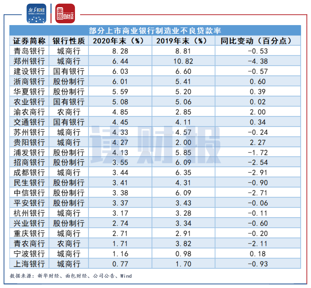 針對A股38家上市商業銀行2020年報制造業貸款情況,新華財經和面包財經研究員從余額、增速、占比以及不良率等角度進行了梳理。