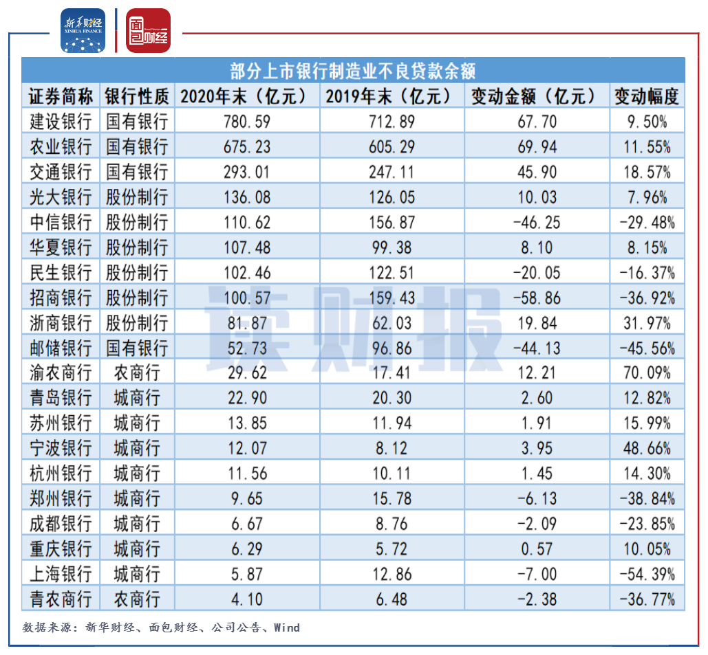 數據顯示,截至2020年末,國有銀行的制造業不良貸款余額整體偏多,其中建行和農行的制造業不良貸款余額分別為780.59億元和675.23億元。股份制銀行中,光大銀行的制造業不良貸款余額偏多,為136.08億元。城商行和農商行的制造業不良貸款余額總體偏小。