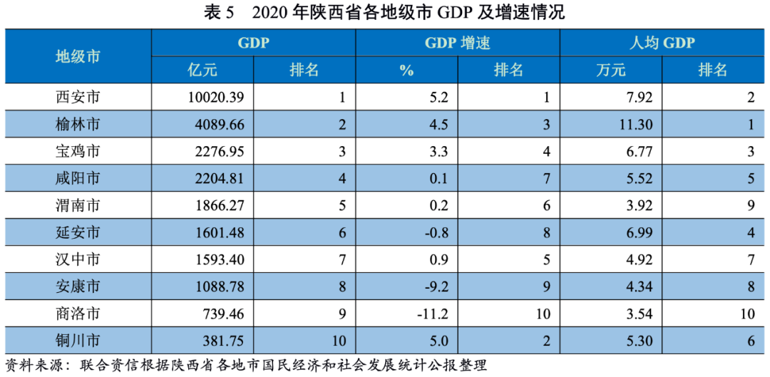 從GDP增速來看,受新冠肺炎疫情及經濟下行等因素影響,2020年,陜西省各地級市的GDP增速普遍放緩,部分地級市出現較大幅度下降甚至表現為負增長。西安市和銅川市GDP增速達到5.0%及以上,榆林市和寶雞市GDP增速在3.0%~5.0%之間,咸陽市、渭南市和漢中市GDP增速在0.0~1.0%之間,延安市、安康市和商洛市均為負增長。