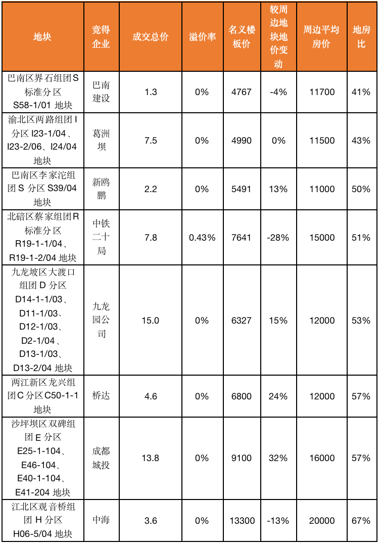 即使是本場土拍中唯一溢價成交的北碚區蔡家地塊(樓板價7641元/平方米),按照周邊在售均價15000元/平方米來測算,地房比僅有51%,也能保持良好的盈利。