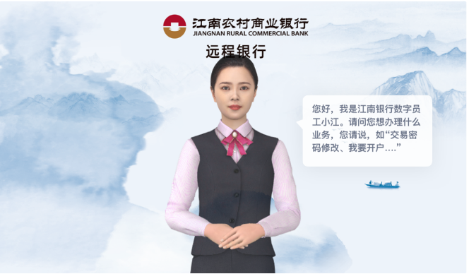 在“全國前十大農(nóng)商行排行榜”中,江南農(nóng)商銀行位列第8位,很大程度上得益于其在金融智能化轉(zhuǎn)型道路上的領(lǐng)跑。過去兩年里,江南農(nóng)商行銀行與京東金融云合作打造了VTM(虛擬柜員機)數(shù)字員工,是全國首個能獨立、全程辦理銀行真實交易的數(shù)字人,形成了多渠道、全場景、端到端的VTM數(shù)字人解決方案。目前該項目已在江南農(nóng)商銀行多個網(wǎng)點部署,并取得了良好的效果。