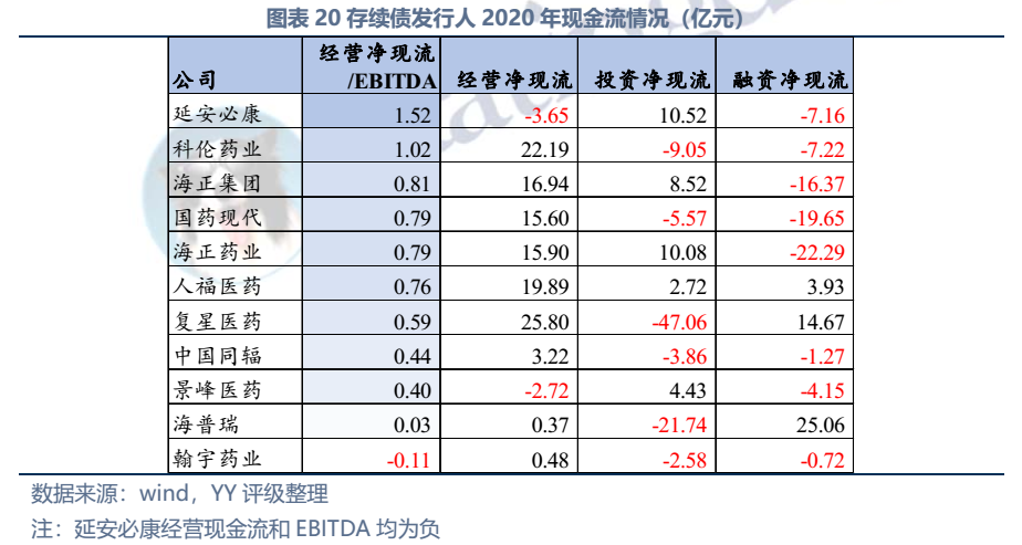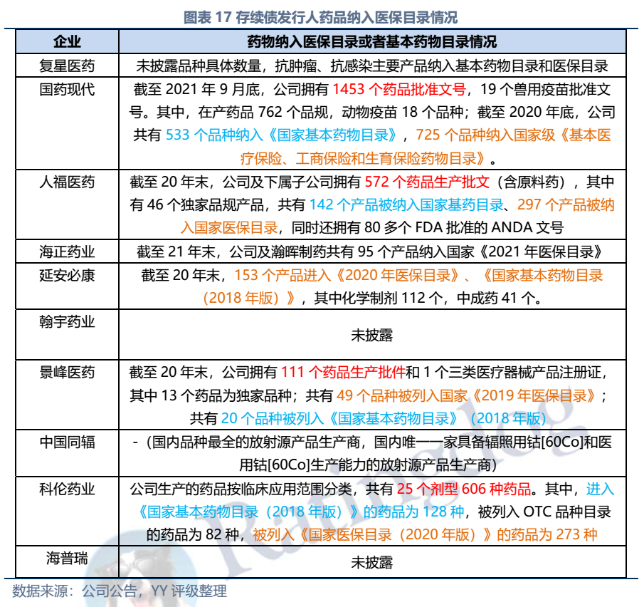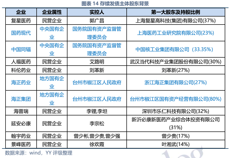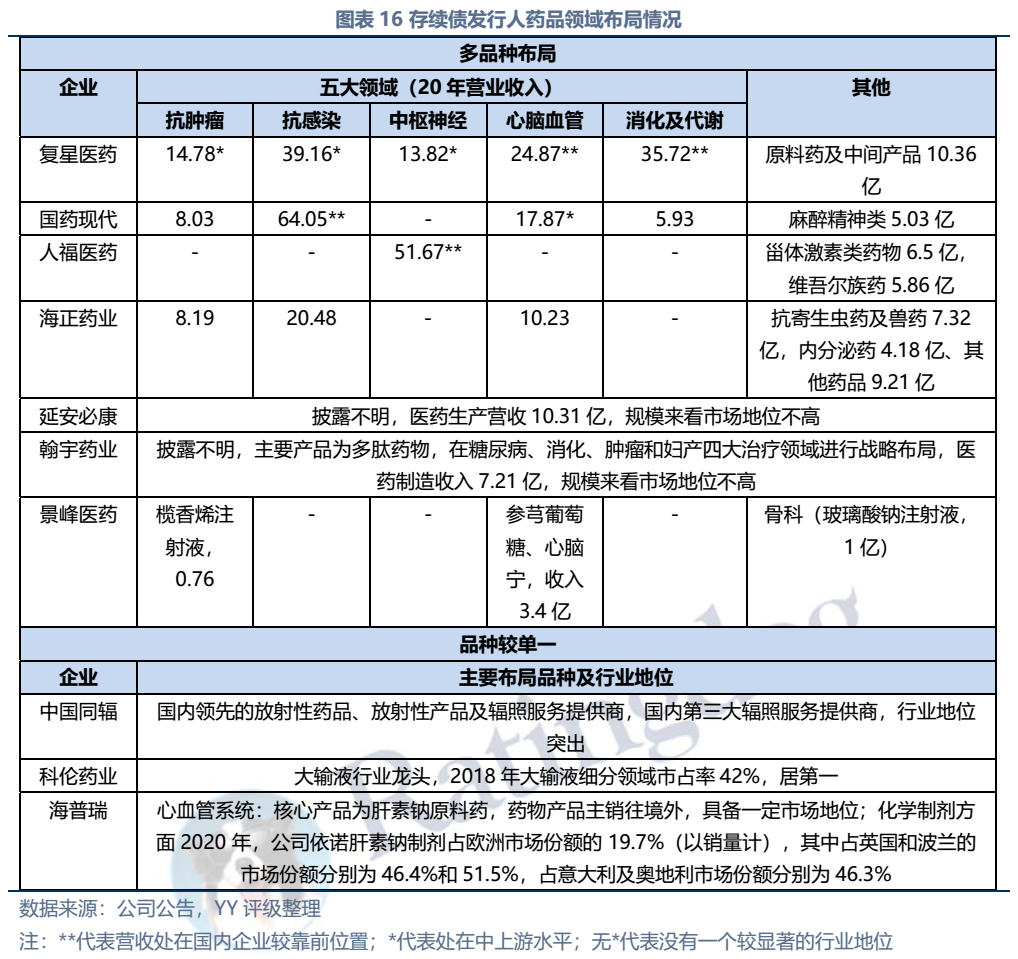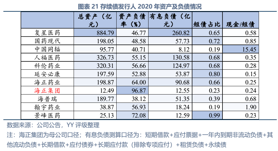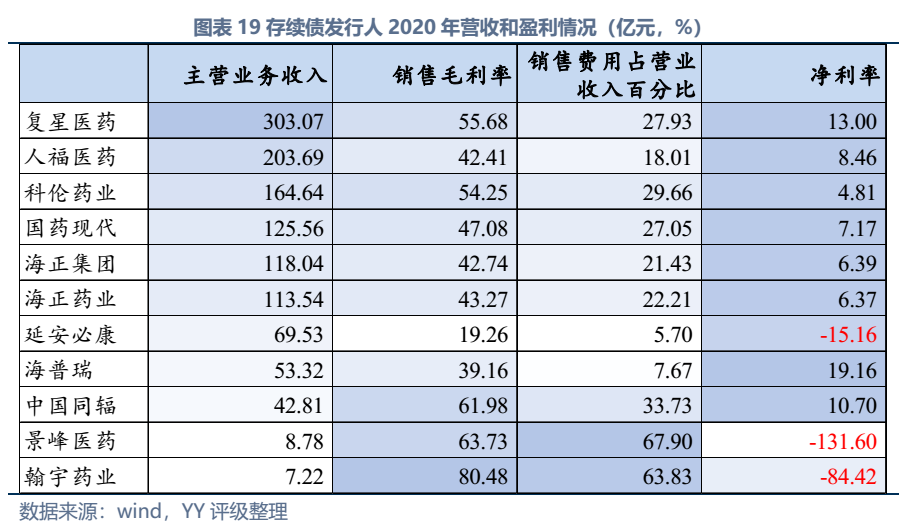 截至2022年3月末西藥行業(yè)發(fā)債主體存續(xù)債券余額僅214億元,存續(xù)債主體11家(含已違約的延安必康、已展期的景峰醫(yī)藥),具體來看:復(fù)星醫(yī)藥、國藥現(xiàn)代、人福醫(yī)藥、海正藥業(yè)、延安必康、翰宇藥業(yè)和景峰藥業(yè)擁有較多樣化的產(chǎn)品布局,復(fù)星醫(yī)藥(在抗感染、中樞神經(jīng)和消化系統(tǒng))、國藥現(xiàn)代(在抗感染、心腦血管)和人福醫(yī)藥(在心腦血管)具備較高的行業(yè)地位,中國同輻、科倫藥業(yè)和海普瑞產(chǎn)品則多聚焦于某一細分領(lǐng)域。財務(wù)方面,整體銷售毛利率較高(平均約50%),但銷售費用對利潤侵蝕較大(銷售費用/營收平均30%),存續(xù)發(fā)行人中除延安必康、景峰醫(yī)藥和翰宇藥業(yè)凈利潤出現(xiàn)虧損外,其他表現(xiàn)尚可;資產(chǎn)及負債方面,復(fù)星醫(yī)藥總資產(chǎn)顯著高于其他企業(yè),規(guī)模優(yōu)勢顯著;海正集團本部杠桿率很高,需關(guān)注債務(wù)壓力;行業(yè)整體短債占比較高,存在一定流動性壓力。