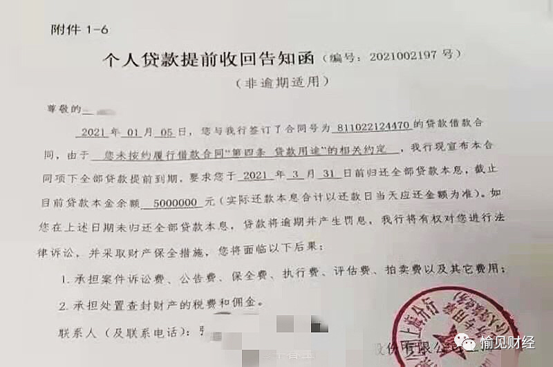 喏,不是已經(jīng)有某股份制銀行上海分行對(duì)“貸款用途”有問(wèn)題的個(gè)貸在發(fā)提前收回函了么。這貸款人估計(jì)也是頭大了,500萬(wàn)要在月底前籌出來(lái),否則還要產(chǎn)生罰息。