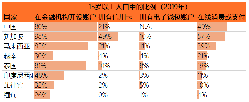 東南亞地區正規金融服務不足,基礎設施落后,產生了大量無銀行賬戶和銀行賬戶不足的人群。根據《e-Conomy SEA 2020》數據,東南亞近4億成年人中,只有1.04億成年人完全擁有銀行賬戶、信用卡、投資和保險服務,充分享受金融服務。由于東南亞公共登記、身份識別系統及可信賴的信用信息缺失無法獲得信用卡等其他金融服務,僅0.98億成年人擁有銀行賬戶。剩余1.98億成年人完全沒有任何賬戶服務,主要原因是東南亞基礎建設能力較弱,金融機構需要對所屬服務類目投入巨大開支,才能滿足所有客戶需求。