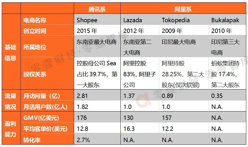 根據2020年iPrice統計,東南亞電商前四位Shopee、Lazada、Tokopedia、Bukalapak優勢十分明顯,月訪問量依次2.81億人次、1.37億人次、0.89億人次、0.35億人次,合計訪問量占前十大平臺的80-90%;Shopee月活人數達到1.82億,其他三家月活也均超過1億。2019年Shopee、Lazada、Tokopedia的GMV依次達到176億美元、130億美元、157億美元,毫無疑問占據頭部顯著優勢。與此同時這四家電商公司都有阿里巴巴或騰訊參與投資的痕跡,某種程度上,可以被看作是兩者在東南亞角力的代理人。