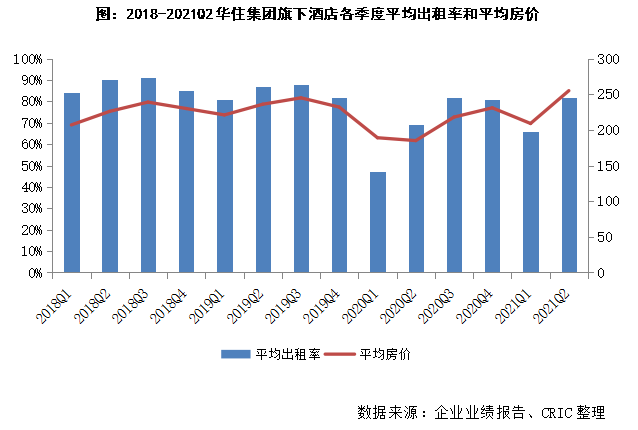 雖然我國酒店業(yè)整體的恢復(fù)相對較慢,但是作為龍頭企業(yè)的華住集團(tuán)的恢復(fù)情況卻相對較好。從企業(yè)的業(yè)績報告數(shù)據(jù)來看,華住從2020年三季度開始其旗下酒店單季度的平均出租率就基本恢復(fù)到了疫情前的水平,平均房價也逐漸提升,2021年二季度還達(dá)到了近年來最高的255元/天。