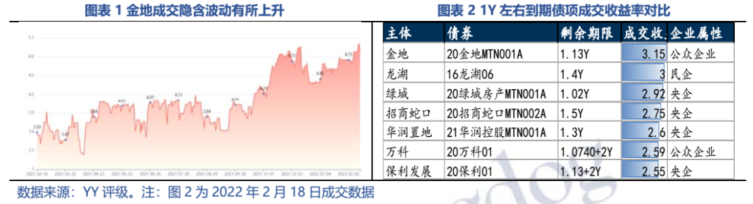 金地的YY隱含成交持續(xù)波動(dòng)上升,同期限債券的收益率要高于老對(duì)手“招保萬(wàn)”和龍頭民企龍湖,二級(jí)估值的走弱反映市場(chǎng)對(duì)金地的擔(dān)憂有所增加。