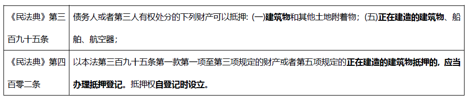 所謂在建工程, 顧名思義, 即為正在建造、尚未辦理所有權(quán)首次登記的房屋等建筑物, 且通常情況下都是尚未經(jīng)過竣工驗收的房屋。根據(jù)《民法典》的相關規(guī)定, 無論是取得所有權(quán)證的房屋還是在建工程均可辦理抵押, 且抵押權(quán)均自登記時設立。
