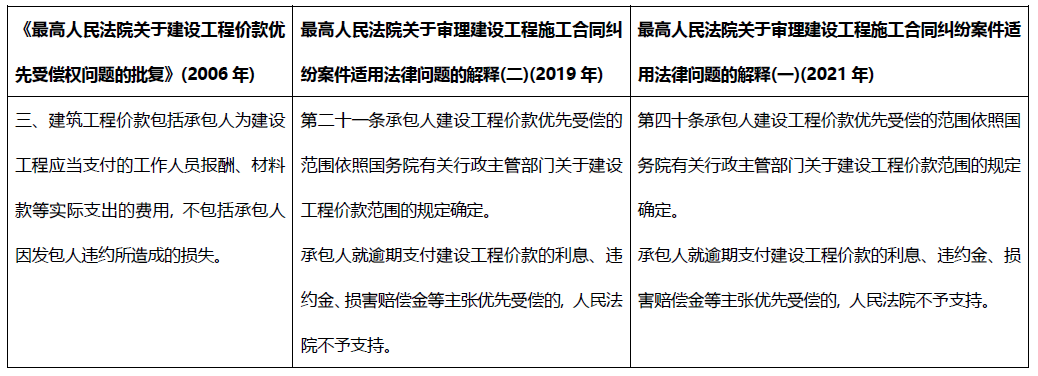 此外, 此前的《批復》、最高人民法院于2018年頒布、2019年實施的現(xiàn)已失效的關于審理建設工程施工合同糾紛案件適用法律問題的解釋(二)(以下簡稱“已失效建設工程合同解釋”)與現(xiàn)在的《建設工程合同解釋一》均明確將逾期支付建設工程價款的違約責任排除在優(yōu)先受償?shù)姆秶? 因此, 金融機構(gòu)作為抵押權(quán)人更應當關注的是承包人主張的工程價款是否包含了利息、違約金、損害賠償金等不屬于工程支出的費用。