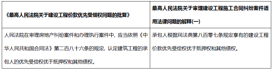 對于建設工程價款與抵押權(quán)的順位問題, 立法態(tài)度和司法實踐的態(tài)度始終一以貫之。從《最高人民法院關于建設工程價款優(yōu)先受償權(quán)問題的批復》(法釋〔2002〕16號, 以下簡稱“《批復》”)到《最高人民法院關于審理建設工程施工合同糾紛案件適用法律問題的解釋(一)》(以下簡稱“《建設工程合同解釋一》”)均規(guī)定, 建筑工程的承包人的優(yōu)先受償權(quán)優(yōu)于抵押權(quán)和其他債權(quán)。