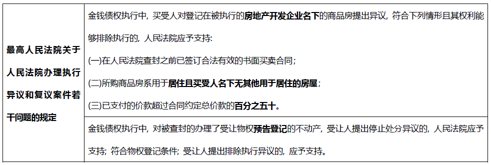 值得注意的是, 已辦理預告登記的受讓人同樣可以排除抵押權(quán)人的執(zhí)行, 并且無需符合上述條件。因此,建議金融機構(gòu)作為債權(quán)人在接受或行使在建工程抵押權(quán)時, 對物權(quán)預告登記情況進行核查, 以免權(quán)利落空或徒增執(zhí)行異議司法程序的不便。而受讓出險房企的預售期房的相對安全模式顯然也是辦理預告登記。