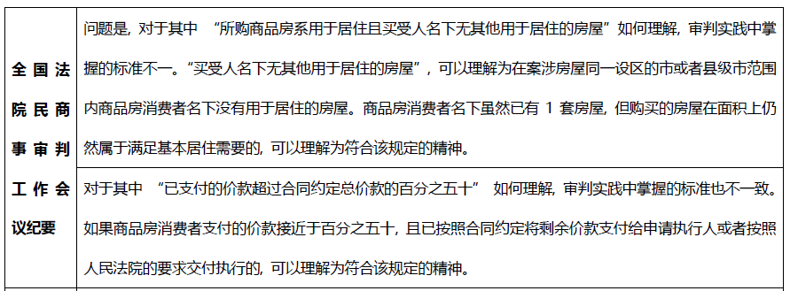 除了農(nóng)民工兄弟之外, 花了真金白銀買房的老百姓也是金融機構(gòu)債權(quán)回收時會面臨的問題。自《批復》起, 最高院即確認了“承包人就該商品房享有的工程價款優(yōu)先受償權(quán)不得對抗已交付購買商品房的全部或者大部分款項后消費者”的原則, 即商品房消費者的物權(quán)期待權(quán)優(yōu)于建設工程價款優(yōu)先受償權(quán), 更優(yōu)于抵押權(quán)。之后, 該規(guī)定亦在《最高人民法院關于人民法院辦理執(zhí)行異議和復議案件若干問題的規(guī)定》(以下簡稱“《執(zhí)行異議規(guī)定》”)中得以體現(xiàn)。根據(jù)《擔保制度解釋理解與適用》, 正在制定中的執(zhí)行異議之訴司法解釋也會吸納該等制度的精神和內(nèi)容。對消費者特殊保護的政策將繼續(xù)一以貫之。