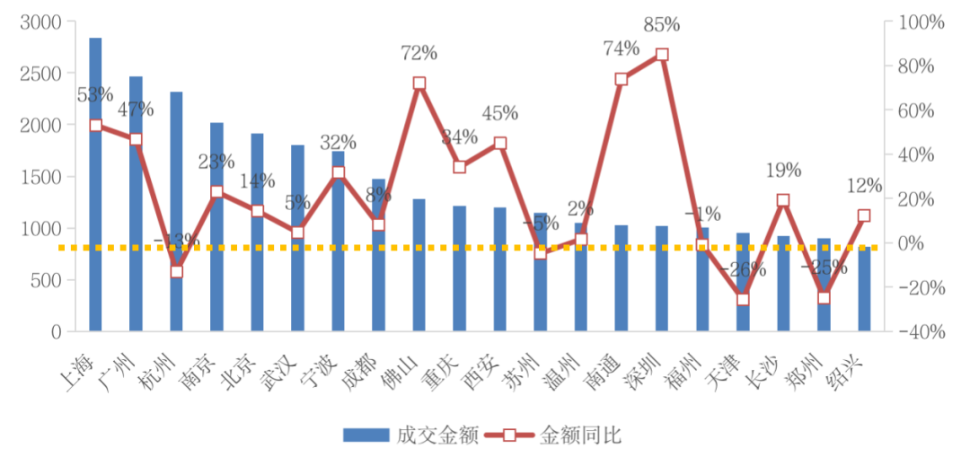 從成交金額排名來看,地價較貴的東部城市仍然是上榜主力,特別是長三角區(qū)域,共有8個城市入榜,且這些城市的成交金額除蘇州、杭州小幅下跌外,其余城市均是同比上漲,尤其是南通,同比漲幅高達74%,漲幅在金額榜TOP20城市中僅次于深圳。