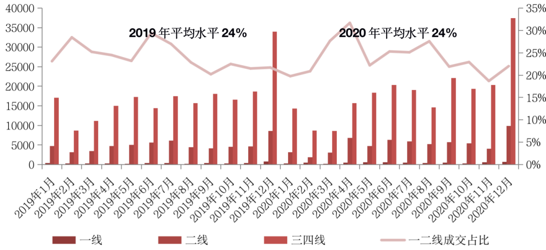 2020年全國300城土地市場成交建筑面積28.7億平方米,較2019年同期上漲7%。成交高峰依舊集中在下半年,年末供應潮的回歸加上各熱點城市推地加速讓12月的成交體量成年度最高峰;成交用地結構方面,住宅面積占比依舊在高位;從城市來看,一二線城市依舊是房企關注重點。