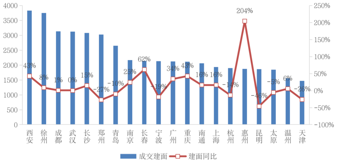 2020年,西安以3830萬平方米成交建面躍居榜首,與去年同期相比,成交建面同比增幅達43%;其次是徐州,成交體量達3746萬平方米,同比上漲8%;排在第三位的是成都,成交量達3131萬平方米,同比漲幅1%。