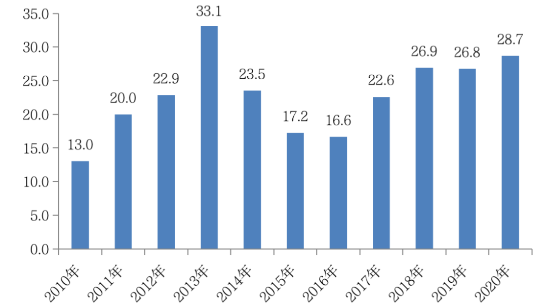分季度來看,2020年溢價率經(jīng)歷了“先升后降”之勢:在優(yōu)質地塊大量成交、各城市降低房企拿地門檻的影響下,溢價率在2020年二季度升至高位,而受三季度后期 “三道紅線”政策出臺,房企融資渠道明顯收緊,溢價率轉而走低,四季度也基本延續(xù)了三季度的下降之勢,溢價率降至12.0%。