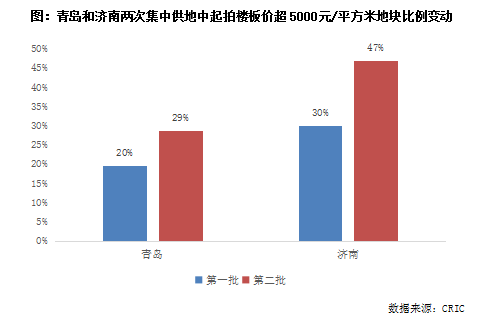 1) 溢價率上限明顯下調:青島和濟南本次出讓所有涉宅地塊的最高溢價率均限制在15%以內,而首輪兩個城市均有地塊成交溢價率超過60%。