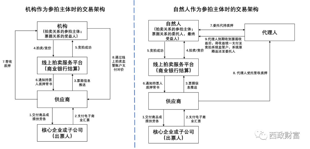在競拍時,若競拍人是自然人的,其資金流向如下:自然人將競拍資金打入拍賣平臺在商業銀行開立的資金專用賬戶——商業銀行主動匹配入賬資金并劃轉至該自然人在商業銀行以自身名義開立的電子賬戶——競得后,競拍資金由商業銀行劃轉至供應商在商業銀行開立的電子賬戶——供應商提款。在提示付款后,資金流向如下:到期時受托代理機構提示付款——資金到代理機構在銀行開設的接受質權質押票據專戶——資金劃入拍賣平臺在商業銀行開立的資金專用賬戶——商業銀行主動匹配入賬資金并劃轉至代理機構在商業銀行以代理人名義開立的電子賬戶——支付至該自然人在商業銀行開設的電子賬戶。