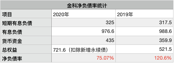 從財務(wù)報表中分析來看,金科的有息負(fù)債應(yīng)該為976.7億元,貨幣資金為435億元,計算凈負(fù)債率時,總權(quán)益數(shù)據(jù)735億元,應(yīng)該是減去了2020年8月之后新增的13.42億元永續(xù)債(監(jiān)管要求),即總權(quán)益為721.58億元。