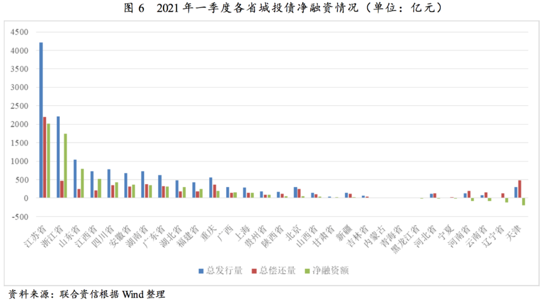 2021年一季度,再融資需求擴(kuò)大及市場情緒修復(fù),城投債發(fā)行規(guī)模大幅增長,但凈融資仍呈區(qū)域分化態(tài)勢;貨幣政策邊際收緊導(dǎo)致發(fā)行利率同比上升明顯。二季度,市場資金面邊際收緊態(tài)勢仍將延續(xù),城投債到期規(guī)模仍較大,但考慮一季度城投債凈融資及二季度地方政府債發(fā)行加速等因素,二季度城投債發(fā)行增速將放緩。貨幣政策邊際收緊及地方政府隱性債務(wù)高壓監(jiān)管的態(tài)勢下,城投債信用風(fēng)險(xiǎn)持續(xù)分化。對于政府債務(wù)負(fù)擔(dān)重、經(jīng)濟(jì)下行壓力大、非標(biāo)信用風(fēng)險(xiǎn)事件頻發(fā)區(qū)域,尤其是信用資質(zhì)較弱、非標(biāo)融資占比較高城投企業(yè)的信用風(fēng)險(xiǎn)仍需持續(xù)關(guān)注。