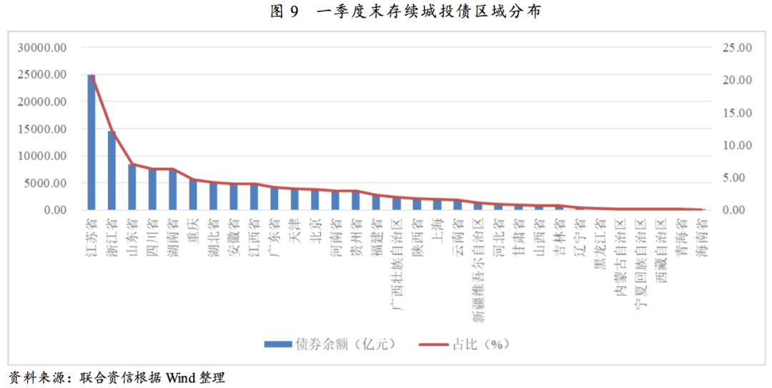截至一季度末,有存續(xù)債券的城投企業(yè)共2812家,存續(xù)城投債券共15930支,存續(xù)債券余額120494.31億元。從地區(qū)分布看,江蘇省城投債券余額為24893.85億元,占比為20.66%,居于首位;浙江省、山東省、四川省和湖南省分列二至五名,占比分別為12.12%、7.01%、6.34%和6.30%。