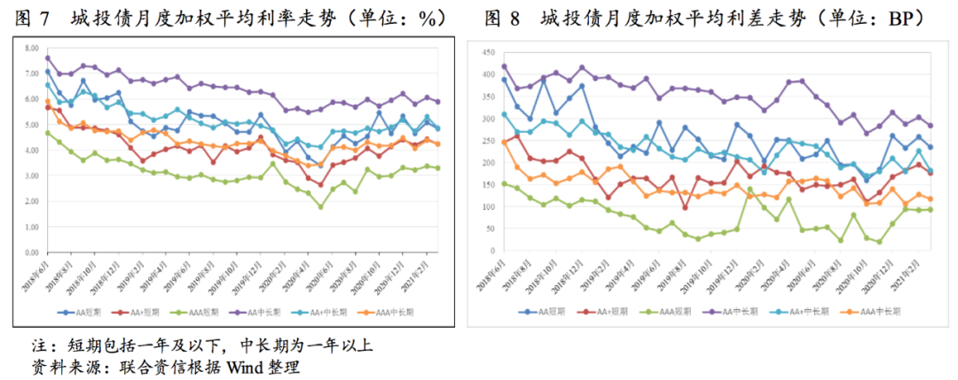 2020年下半年以來,隨著新冠肺炎疫情形勢趨穩(wěn),宏觀經(jīng)濟(jì)穩(wěn)步回升,貨幣政策逐步回歸常態(tài)化,資金面整體有所趨緊。2021年一季度,各級別、期限城投債的發(fā)行利率同比均有所上升。環(huán)比來看,各級別短期城投債的發(fā)行利率環(huán)比均小幅上升,各級別中長期城投債的發(fā)行利率均略有下降,主要是在春節(jié)前后時(shí)點(diǎn)因素以及央行公開市場大規(guī)模凈回籠影響下,2021年初市場流動性短暫趨緊、投資者期限偏好呈現(xiàn)分化所致。分月來看,1月,各級別、各期限城投債的發(fā)行利率相對較低,且環(huán)比均有所下降,其中AA級中長期、AA+級中長期和AAA級中長期分別環(huán)比下降0.41個(gè)、0.44個(gè)和0.41個(gè)百分點(diǎn),整體拉低了一季度各級別中長期城投債發(fā)行利率的平均水平;2月,各級別、各期限城投債的發(fā)行利率均明顯上升;3月,各級別、期限城投債的平均發(fā)行利率環(huán)比均有所下降,但整體小幅高于1月的平均水平。一季度,各級別、期限城投債發(fā)行利率呈現(xiàn)先上升后下降的“倒V”形態(tài)。
