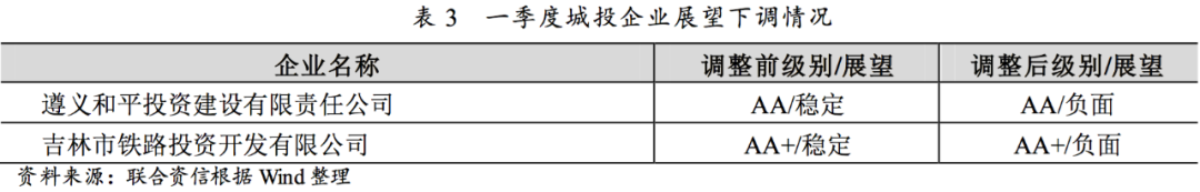 一季度,城投企業(yè)主體級別無調(diào)降的情況。評級展望由穩(wěn)定調(diào)整為負(fù)面的城投企業(yè)2家,貴州省和吉林省各1家,展望下調(diào)原因主要包括區(qū)域融資環(huán)境較差、企業(yè)自身流動性壓力較大、新增不良信貸記錄等。