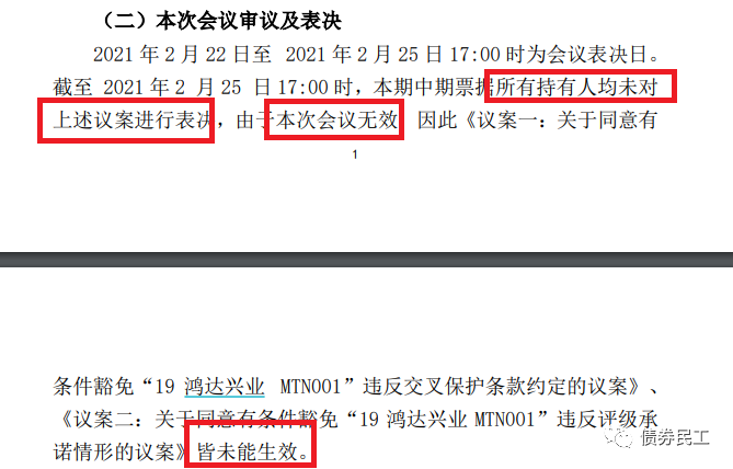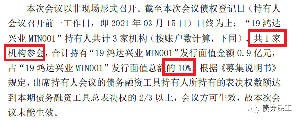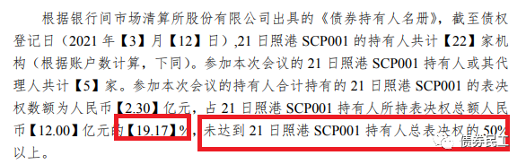 4、2021年3月16日,“”第一次持有人會(huì)議的持有人所持有的表決權(quán)數(shù)額未達(dá)到本期債務(wù)融資工具總表決權(quán)的三分之二以上,持有人會(huì)議無(wú)效。主承銷商在3月19日也公告,