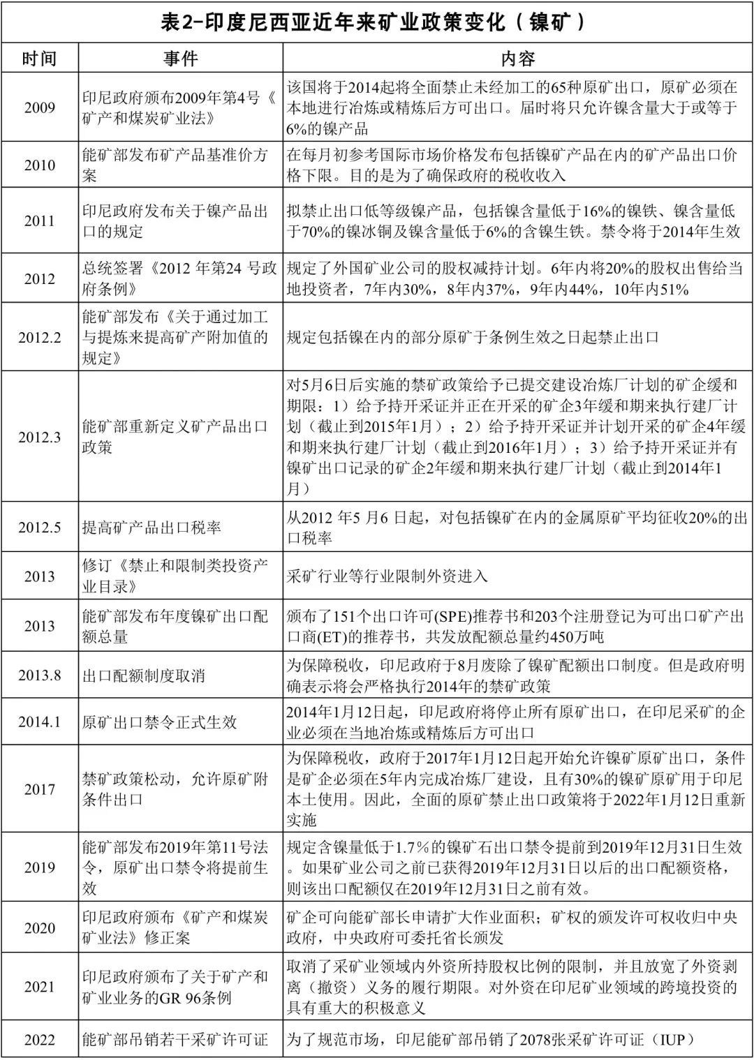 印尼政府對外國投資者投資鎳礦的限制主要集中在原礦出口和準入限制兩方面。2010年以前,印尼政府為了鼓勵礦產資源開發(fā),促進經(jīng)濟發(fā)展,并不完全限制鎳礦原礦出口。2010年以來,印尼逐漸收緊了包括鎳礦石在內的原礦出口政策,政府希望借助本國的資源稟賦優(yōu)勢來吸引外國資本參與本國礦業(yè)相關產業(yè)鏈的工業(yè)基礎建設,從而擴大就業(yè),增加稅收,把更多的產值留在國內,而不是僅僅出賣礦物原材料。因此,印尼有關包括鎳礦在內的原礦出口政策總體呈逐漸收緊的態(tài)勢:2012年5月,印尼政府開始逐步提高礦產品出口稅率;2014年1月,印尼實施全面禁止鎳礦原礦出口政策;2017年1月,印尼政府為了保障本國稅收,開始附條件允許原礦出口;2019年,印尼能礦部將原定于2022年1月重新實施的原礦出口禁令提前至2020年1月1日生效;2022年3月,印尼政府表示可能從今年開始對鎳產品加征出口稅(如表2)。