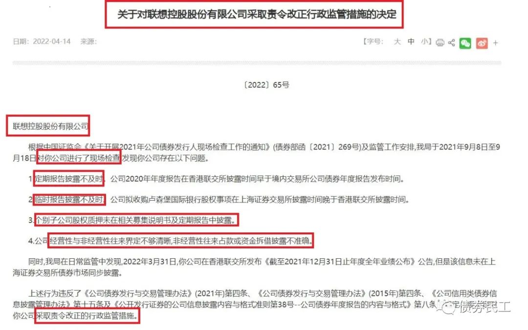 根據北京證監局官方網站2022年4月14日披露的信息,聯想控股股份有限公司(以下簡稱“聯想控股”)被采取責令改正行政監管措施,主要原因是定期報告披露不及時、臨時報告披露不及時、經營性與非經營性往來界定不夠清晰等。
