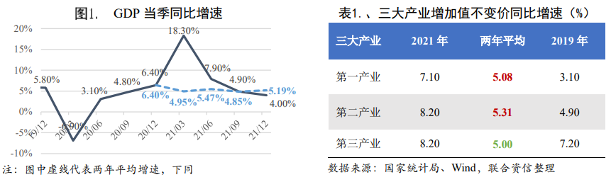 政策回歸常態(tài)化等背景下,我國經(jīng)濟(jì)上半年持續(xù)復(fù)蘇,三季度經(jīng)濟(jì)增長有所放緩,四季度小幅改善。經(jīng)初步核算,2021年我國國內(nèi)生產(chǎn)總值114.37萬億元,按不變價計算,同比增長 8.10%,兩年平均增長[1]5.11%。分季度來看,GDP 當(dāng)季同比增速在基數(shù)影響下逐季回落。從兩年平均增速來看,上半年我國經(jīng)濟(jì)穩(wěn)定修復(fù);三季度 GDP 增速明顯回落,主要受供給端約束和內(nèi)生動能不足的共同影響;隨著保供穩(wěn)價和助企紓困政策有力推進(jìn),供給端限電限產(chǎn)的約束有所改善,四季度經(jīng)濟(jì)增長有所加快。
