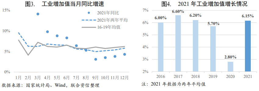 工業(yè)生產(chǎn)基本恢復(fù)到疫情前水平,上半年表現(xiàn)強(qiáng)勢,三季度觸底后四季度小幅回升。2021年全國規(guī)模以上工業(yè)增加值同比增長9.60%,兩年平均增長6.15%,基本接近疫情前水平。2021年上半年工業(yè)增加值當(dāng)月同比增速在基數(shù)的影響下呈下行趨勢,剔除基數(shù)因素后,1-6月當(dāng)月兩年平均增速除了3月外均高于2016-2019年同期均值水平,上半年我國工業(yè)生產(chǎn)表現(xiàn)較為強(qiáng)勢。三季度受國際大宗商品價格不斷上漲、能耗雙控以及缺芯等供應(yīng)鏈緊張問題影響,工業(yè)生產(chǎn)同比增速與兩年平均增速變化趨勢均有所回落。隨著能源供應(yīng)保障有所加強(qiáng)、穩(wěn)定市場價格等政策措施成效顯現(xiàn)、國外疫情反彈,四季度工業(yè)生產(chǎn)呈現(xiàn)小幅回升態(tài)勢,但仍低于2016-2019年同期均值水平。