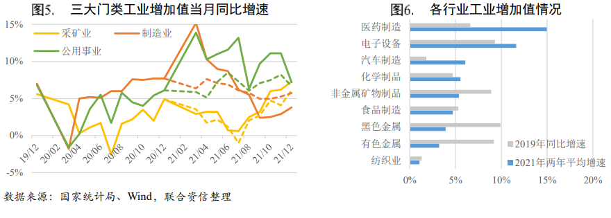 三大門類均實(shí)現(xiàn)較快增長。2021年,采礦業(yè)、制造業(yè)以及電力、熱力、燃?xì)饧八a(chǎn)和供應(yīng)業(yè)增加值同比分別增長5.30%、9.80%、11.40%,兩年平均增速分別為2.87%、6.55%、6.60%。主要行業(yè)[2]方面,醫(yī)藥制造業(yè)、計算機(jī)、通信和其他電子設(shè)備制造業(yè)以及汽車制造業(yè)受出口帶動2021年工業(yè)增加值兩年平均增速較高,但受芯片、電池等供應(yīng)鏈短缺影響,下半年特別是8月汽車制造產(chǎn)能擴(kuò)張承壓;而黑色、有色金屬冶煉及延壓加工業(yè)和非金屬礦物制品業(yè)工業(yè)增加值兩年平均增速較2019年下降較大,主要是限電限產(chǎn)等措施對鋼鐵、有色和水泥等高耗能行業(yè)產(chǎn)能負(fù)面影響較大,其中鋼鐵工業(yè)增加值兩年平均增速繼續(xù)下滑,除了供給端的限制外,還受到需求端地產(chǎn)降溫的影響。