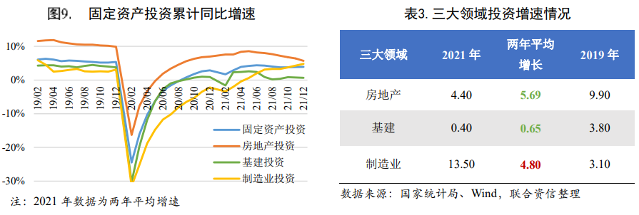 固定資產(chǎn)投資修復(fù)緩中趨穩(wěn)。2021年全國固定資產(chǎn)投資(不含農(nóng)戶)54.45萬億元,同比增長4.90%;兩年平均增長3.90%,較疫情前水平(2019年為5.40%)仍有一定差距。固定資產(chǎn)投資結(jié)構(gòu)進(jìn)一步優(yōu)化:制造業(yè)投資繼續(xù)加速,支撐固定資產(chǎn)投資向上修復(fù);而房地產(chǎn)和基建投資增速延續(xù)下行,對固定資產(chǎn)投資的拉動作用進(jìn)一步下降。