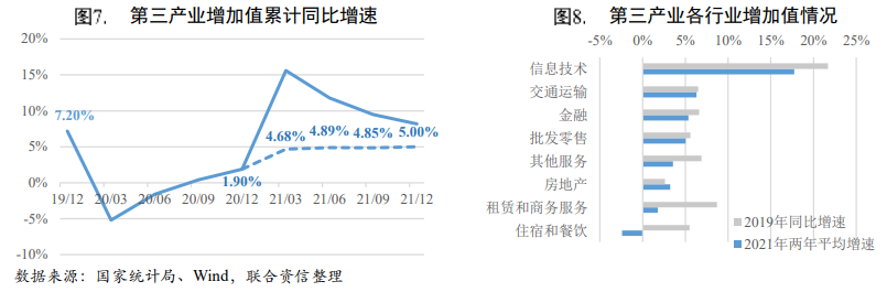 服務(wù)業(yè)生產(chǎn)較疫情前水平仍有較大差距。2021 年第三產(chǎn)業(yè)增加值同比增長8.20%,兩年平均增長 5.00%,服務(wù)業(yè)仍有較大的向上修復(fù)空間。第三產(chǎn)業(yè)主要行業(yè)[3]中僅房地產(chǎn)行業(yè)增加值兩年平均增速超過疫情前水平,住宿和餐飲業(yè)拖累明顯,兩年平均增速仍處于負(fù)值區(qū)間。