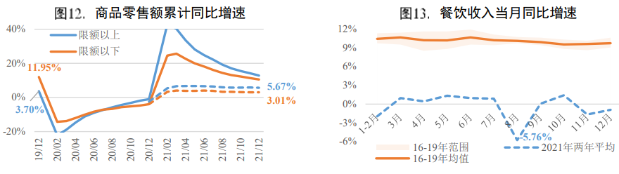 限額以下商品零售和接觸性服務(wù)仍是消費(fèi)的主要拖累。2021年商品零售額同比增長11.80%,兩年平均增長4.51%,不及疫情前水平(2019年為7.90%)。商品零售與疫情前差距主要體現(xiàn)在限額以下的部分:2021年限額以下商品零售額兩年平均增速僅為3.01%,與疫情前2019年的增速水平(11.95%)相差較大。限額以上商品零售額兩年平均增速均為正值,汽車銷售上半年表現(xiàn)強(qiáng)勢,而自二季度以來受芯片供應(yīng)短缺以及排放標(biāo)準(zhǔn)升級切換期等影響較大,汽車零售額兩年平均增速多次落入負(fù)值區(qū)間。餐飲收入受疫情沖擊較大,2021年餐飲收入同比增長18.60%,兩年平均下降0.55%,餐飲消費(fèi)規(guī)模仍不及疫情前水平。餐飲收入等接觸性消費(fèi)由于對疫情變化更為敏感,整體波動較大且較疫情前水平差距較大,仍有較大的恢復(fù)空間。