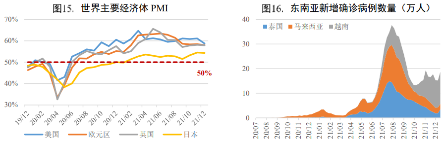 海外產(chǎn)需缺口、出口替代效應(yīng)以及低基數(shù)等因素支撐我國出口高增長。2021年主要經(jīng)濟(jì)體PMI高位運(yùn)行,全球經(jīng)濟(jì)持續(xù)恢復(fù),海外需求旺盛但產(chǎn)需依然存在較大缺口,加之東南亞疫情反復(fù)導(dǎo)致的出口替代作用,共同支撐我國出口維持高景氣度。但海運(yùn)領(lǐng)域出現(xiàn)的集裝箱運(yùn)力緊張、運(yùn)價高漲問題對出口產(chǎn)生了一定的負(fù)面影響。三季度以來出口價格上漲對出口金額的貢獻(xiàn)度上升,集成電路、手機(jī)和家用電器等受大宗商品漲價明顯的行業(yè),出口均表現(xiàn)出量減價增的特點(diǎn)。從主要出口產(chǎn)品對整體出口同比增速的拉動來看,自動數(shù)據(jù)處理設(shè)備及其零部件、集成電路依然是出口的最大拉動項;紡織紗線、織物及制品由于上年基數(shù)較高,對出口造成負(fù)向拉動。