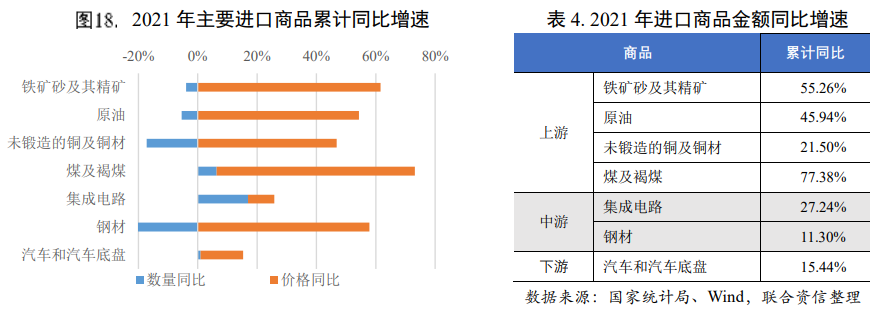 國際大宗商品漲價、人民幣升值等多重因素帶動進(jìn)口金額增長。價格因素支撐主要進(jìn)口商品金額高增長:鐵礦砂及其精礦、原油和未鍛造的銅及銅材、煤及褐煤、鋼材以及汽車和汽車底盤進(jìn)口金額增長主要由價格大幅增長拉動;僅集成電路的數(shù)量增速高于價格增速,表明數(shù)量因素對金額增長的貢獻(xiàn)大于價格拉動。多數(shù)商品呈現(xiàn)量減價揚(yáng)的特點(diǎn),國際大宗商品價格的上漲抑制了部分國內(nèi)需求。此外,2021年以來人民幣匯率三大指數(shù)同步提升,人民幣升值一定程度上也對擴(kuò)大進(jìn)口產(chǎn)生了積極作用。