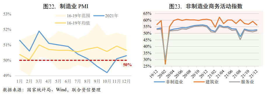 2021年,我國制造業(yè)PMI除9、10月外均位于榮枯線上,整體呈現(xiàn)出上半年景氣度較高、下半年景氣度較低的態(tài)勢。上半年制造業(yè)PMI波動在51%左右的水平,高于2016-2019年同期的均值,上半年制造業(yè)景氣度較高;而下半年制造業(yè)PMI則在榮枯線上下波動,回落至低于2016-2019年同期的均值的區(qū)間,下半年制造業(yè)景氣度有所回落。分企業(yè)類型來看,小型企業(yè)生產(chǎn)經(jīng)營面臨的壓力仍然較大,景氣水平偏弱。12月,制造業(yè)PMI回升0.20個百分點(diǎn)至50.30%,延續(xù)小幅回升態(tài)勢。