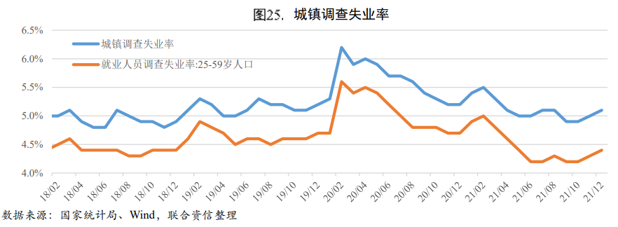 就業(yè)形勢總體基本穩(wěn)定。2021年城鎮(zhèn)新增就業(yè)1045萬人,完成全年目標(biāo)任務(wù)的95%;城鎮(zhèn)調(diào)查失業(yè)率均值為5.10%,低于全年5.50%左右的調(diào)控目標(biāo)。從結(jié)構(gòu)看,重點(diǎn)群體就業(yè)情況有所改善。2021年下半年,就業(yè)主體人群(25-59歲人口)失業(yè)率一直穩(wěn)定在4.50%以下,低于前兩年同期水平;2021年末,全國農(nóng)民工規(guī)模達(dá)到2.93億人,較上年末增加691萬人,恢復(fù)至疫情前2019年末水平。