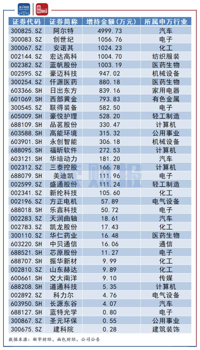申萬行業分類下,汽車行業的增持金額排在首位,約為0.52億元,醫藥生物行業的增持金額排在第二,約為0.19億元。電子行業的增持金額也排名靠前,約為0.18億元。