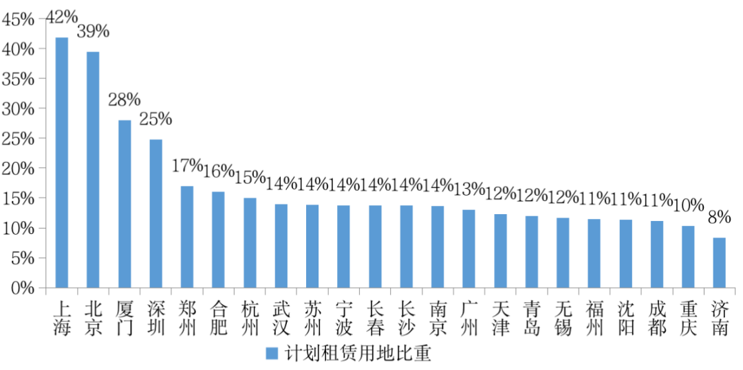 22個(gè)重點(diǎn)城市租賃宅地總計(jì)劃供應(yīng)量占宅地供應(yīng)總規(guī)模的比重大幅提升至15%,可見,“十四五”期間,各大重點(diǎn)城市對于租賃宅地供應(yīng)的重點(diǎn)程度均明顯提升。