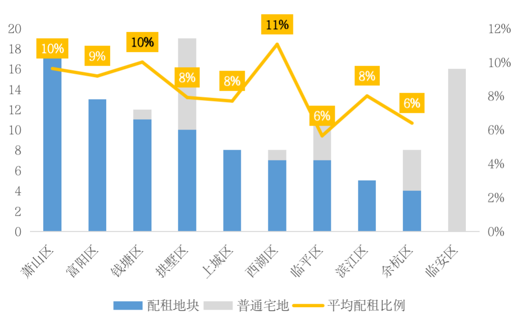 核心板塊優(yōu)質(zhì)宅地深度捆綁配建也是杭州租賃供應(yīng)的典型特征。杭州市區(qū)中除臨安外,其余區(qū)域的出讓地塊大部分均有配建公租房要求,其中富陽、上城、濱江等區(qū)域出讓地塊更是全部要求配建公租房。