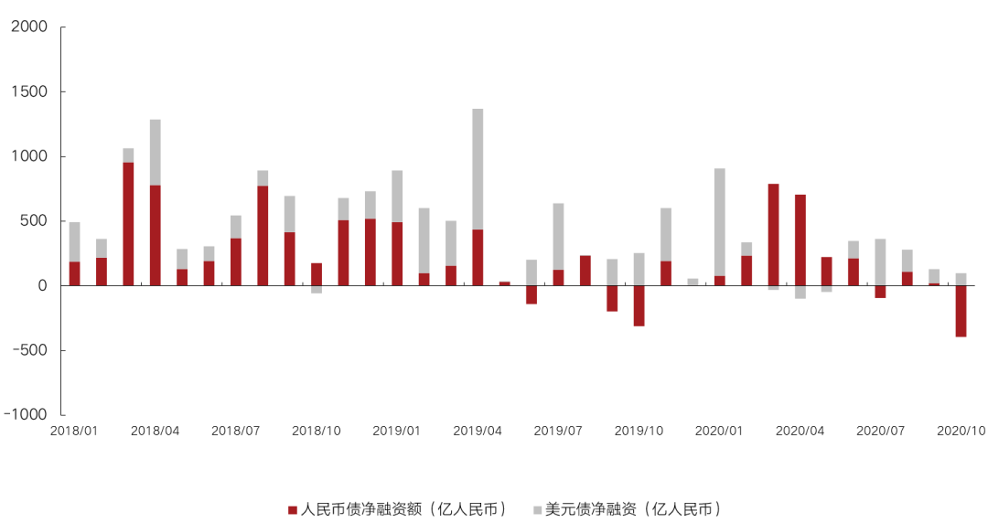 2020年前10月,房企人民幣債凈融資額1869.6億人民幣、美元債凈融資額234.9億美元,考慮到融資整體趨于收緊,年末月均凈融資額或將出現收縮。