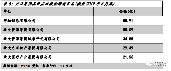 ②從其他應收款項目來看,兩者又有顯著的差異。方正集團的其他應收款余額規模過高,從明細來看,2019年6月底披露的前五大應收對象應收金額達196億元,占比為33%。其中除華融證券外皆為下屬子公司,資金占用明顯。