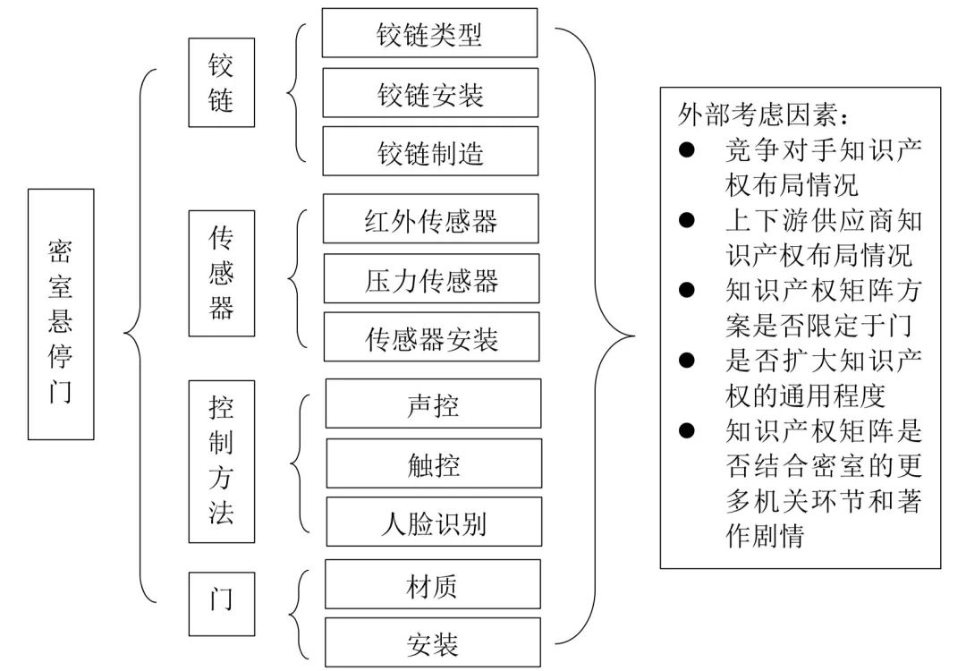 這樣一扇看似平平無(wú)奇的懸停門,倘若結(jié)合密室游戲所希望實(shí)現(xiàn)的效果去進(jìn)行了專門設(shè)計(jì),那么可挖掘的專利點(diǎn)其實(shí)有很多,足以構(gòu)建專利矩陣(注:本文在此僅提供相關(guān)思路,并非主張實(shí)際中必然按照本文的思路進(jìn)行專利矩陣申請(qǐng))——我們可以從密室懸停門的主要結(jié)構(gòu)件為出發(fā)點(diǎn),通過(guò)鉸鏈、傳感器、控制方法、門面等引子,進(jìn)行如下構(gòu)件拆解和專利挖掘。