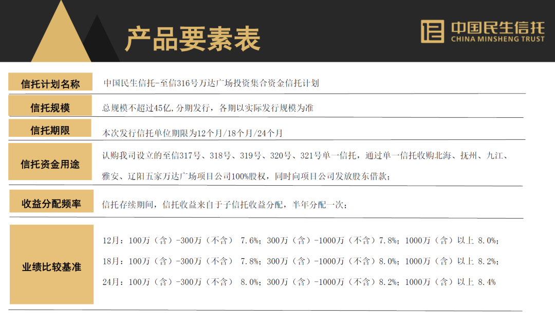 在產(chǎn)品推介要素表當(dāng)中,強(qiáng)調(diào)了該信托計(jì)劃的資金用于設(shè)立單一信托,收購北海、撫州、九江、雅安和遼陽五家萬達(dá)廣場項(xiàng)目公司100%的股權(quán),同時(shí)向項(xiàng)目公司發(fā)放股東借款。