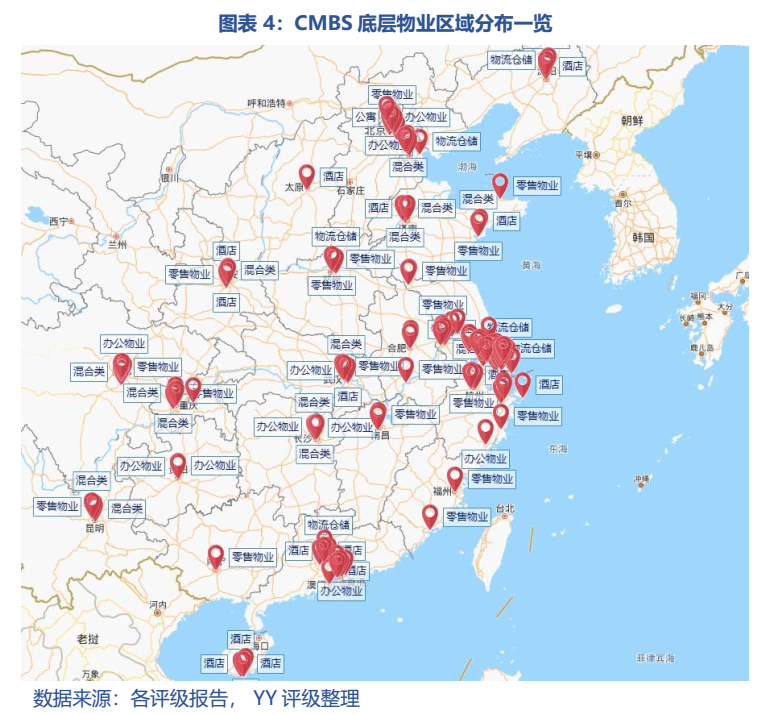 同時,將包含多個資產的CMBS拆開后(共282個物業(yè))為混合類68個、零售物業(yè)78個、辦公物業(yè)60個、酒店37個以及物流倉儲22個,辦公、零售或辦公購物綜合體的混合類仍為CMBS發(fā)行的主力。