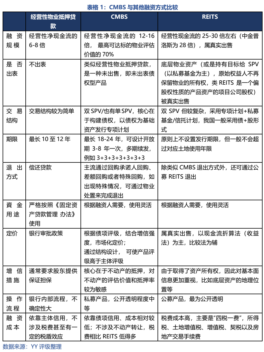 相比REITS的股性或經營性抵押貸款的間接融資特性,CMBS有更強債性。具體體現為相較REITS不真實出售,而相較經營性物業(yè)抵押貸款融資額較高、期限較長、資金使用限制相對較少。