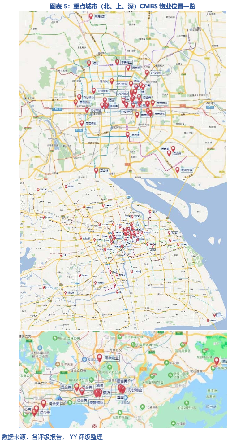 我們以A1優(yōu)先級的CMBS與主體信用利差為例,不同資產類型和不同城市的利差皆有不同。其中辦公物業(yè)、混合類、酒店、零售物業(yè)、物流倉儲的平均利差約為36、14、45、7、22 bp;而我們只看重點城市北京、上海、深圳的話(多地為多地多個資產,平均12 bp)平均利差約為22、40、40bp。綜合而言,從利差角度,市場對核心城市(北上深)的辦公物業(yè)、酒店、物流倉儲資產認可程度較好,高于總體平均利差,而混合類和零售物業(yè)類資產雖然占比很高但方差也較大。